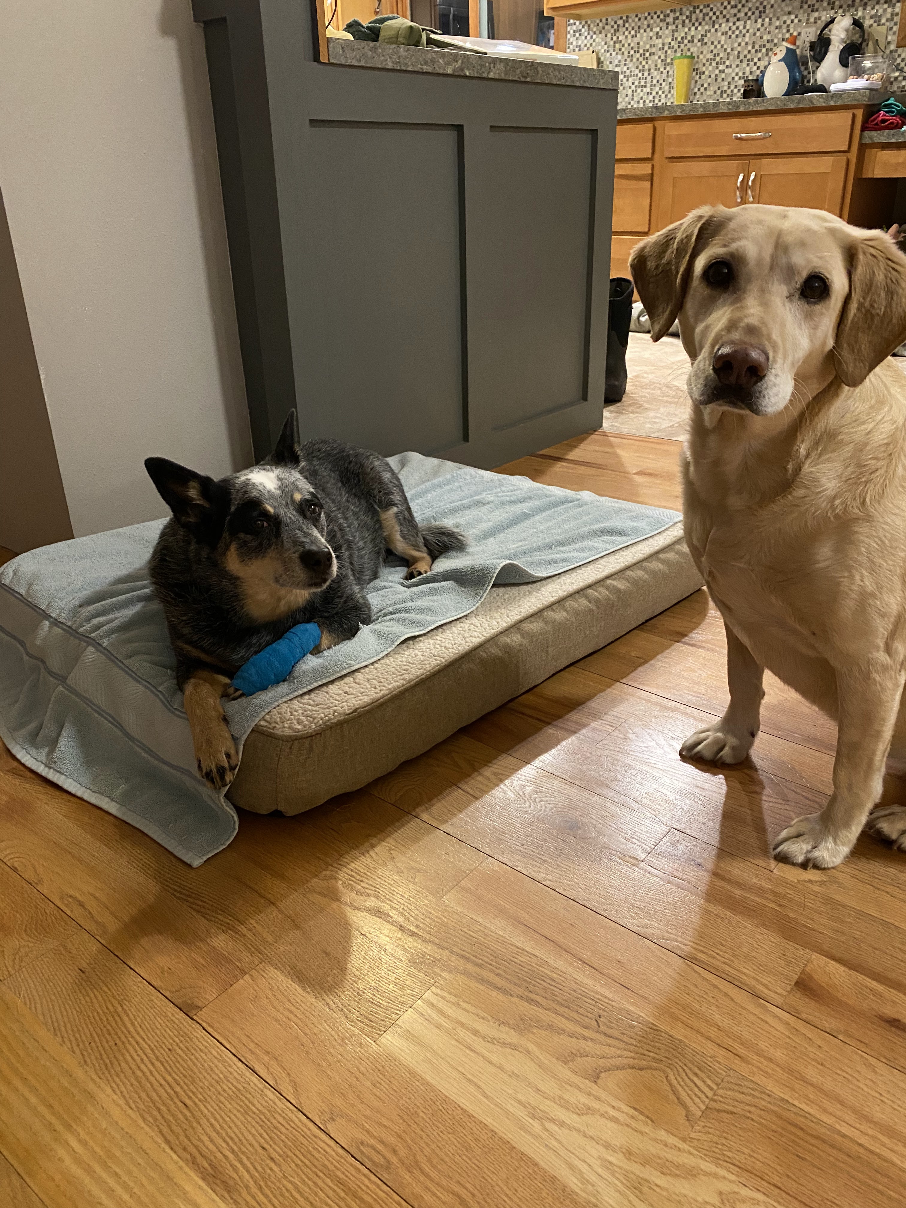• Had to change the dressing on Mayhem’s foot because I forgot to wrap it during a pee break. She snapped at me a couple times, but I did it!